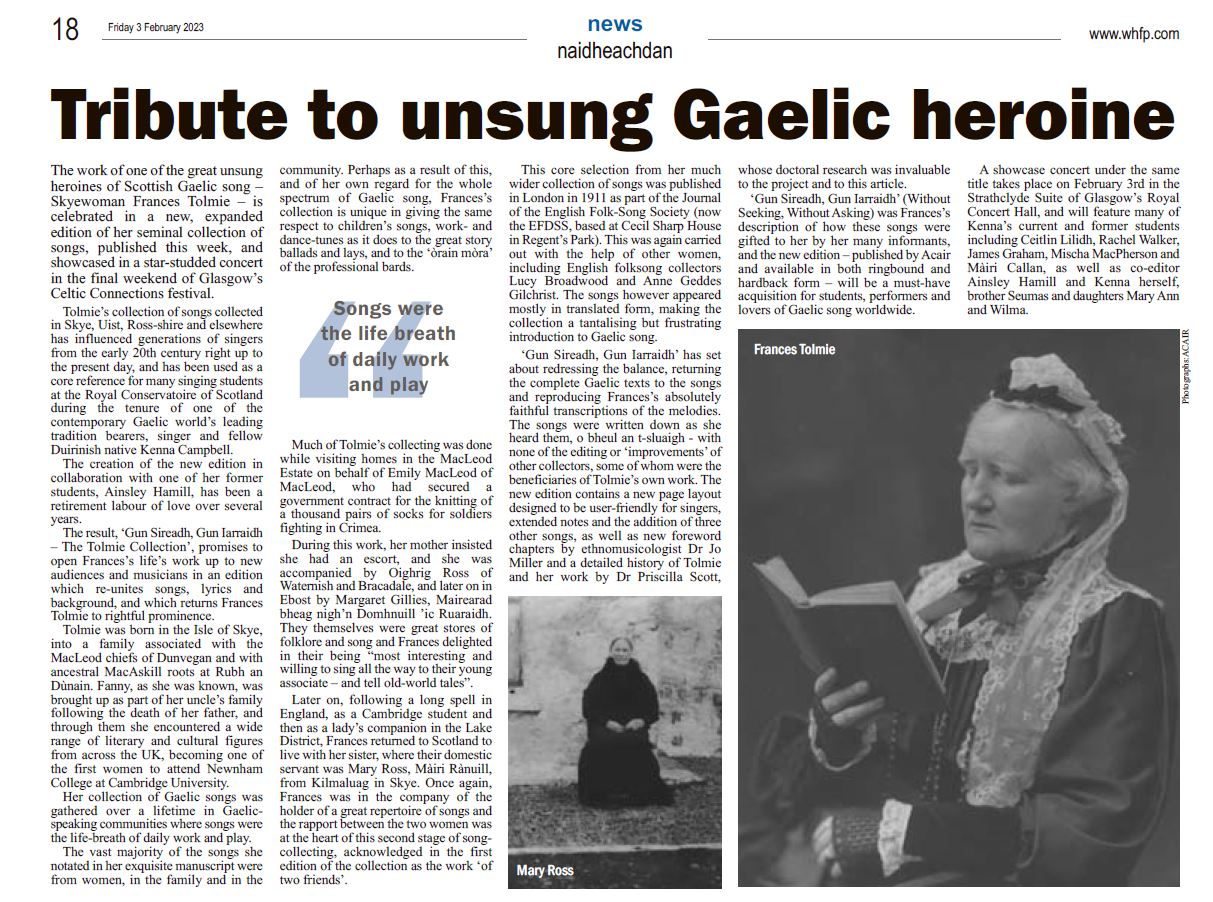 3 March 2023On Friday 3 February as part of Celtic Connections there was a concert showcasing some of the songs and tunes collected by 19th century Gaelic scholar Frances Tolmie. She is a woman who has featured in the Clan MacLeod Magazine on more than one occasion. The concert was to launch a book ‘Gun Sireadh, Gun Iarraidh‘ subtitled ‘The Tolmie Collection’. The Gaelic phrase ‘Gun Sireadh, Gun Iarraidh’ was apparently a favourite of Frances’. The literal translation is ‘without seeking, without asking’. It conveys the meaning in English of serendipity. But it was no happy accident that so much of the musical heritage of the Highlands was recorded by Frances. It was dogged and heroic work on her part. Thanks to her we have much of that ancient oral culture passed to us that would otherwise have been lost forever.